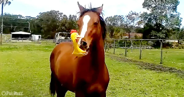 Playful horse delights audiences with a whimsical rubber chicken